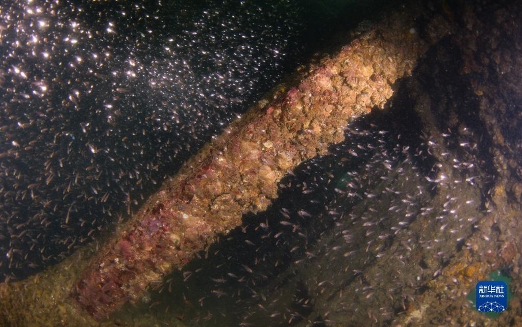 這是在蜈支洲島海域海洋牧場沉船魚礁內(nèi)拍攝的魚群(5月16日攝)。