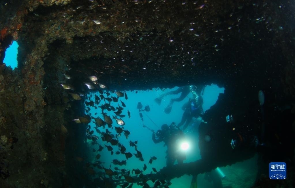 攝影愛好者在蜈支洲島海域海洋牧場拍攝沉船魚礁內(nèi)的魚群(2021年5月21日攝)。
