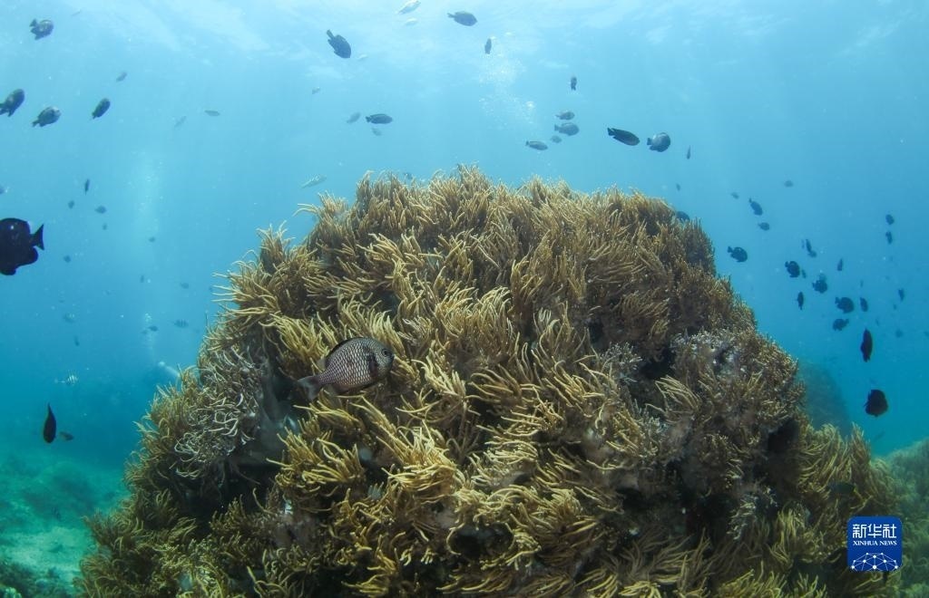 這是在蜈支洲島海域海洋牧場拍攝的珊瑚和魚群(2021年5月21日攝)。