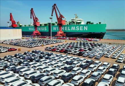 一艘滾裝船在江蘇連云港港東方港務(wù)分公司碼頭裝運(yùn)出口汽車(chē)(2023年5月16日攝) 王健民攝 / 本刊