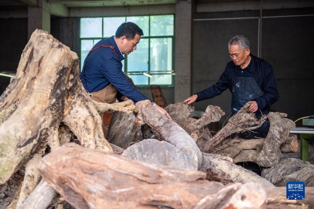 5月23日,在洞口縣巖山鎮(zhèn)陽家山村,傅立先(左)和父親傅金林在挑選木雕材料。