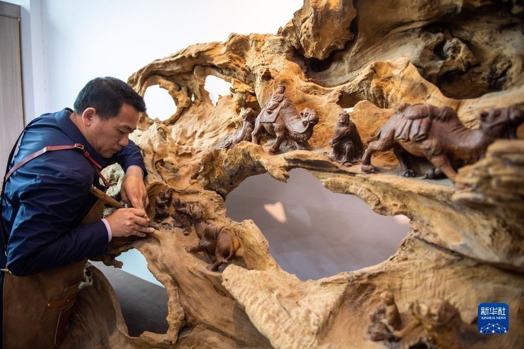 5月23日,在洞口縣巖山鎮(zhèn)陽家山村,洞口木雕非遺傳承人傅立先在創(chuàng)作木雕作品《絲綢之路》。