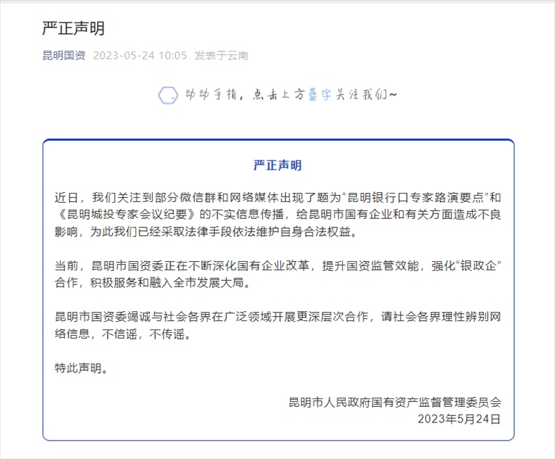 ·昆明市國資委發(fā)布聲明,“昆明銀行口專家路演要點”和《昆明城投專家會議紀(jì)要》不實。