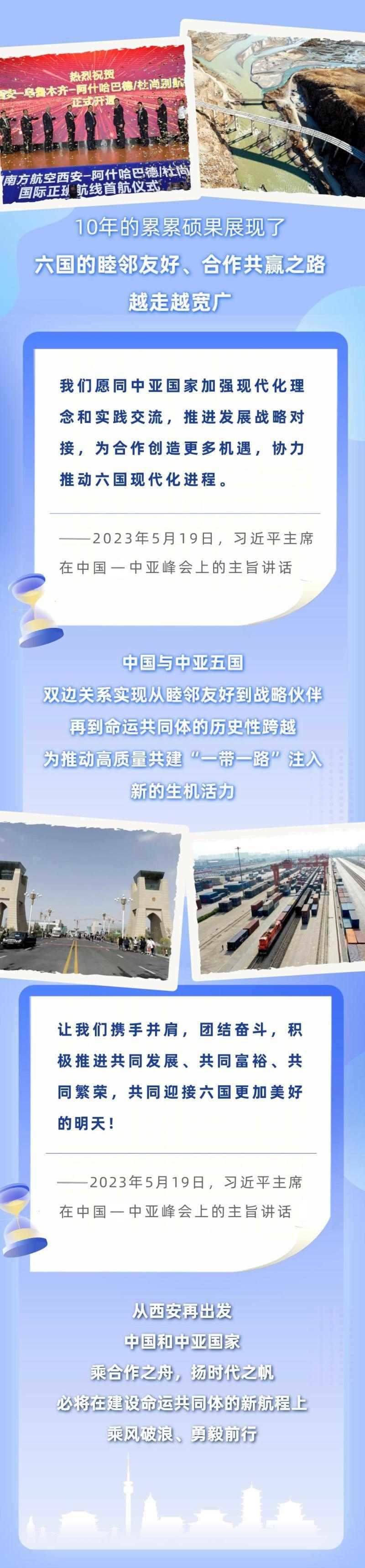 “今天我們?cè)谖靼蚕嗑?,續(xù)寫千年友誼,開辟嶄新未來,具有十分重要的意義?!?月19日,習(xí)近平主席在陜西西安主持中國—中亞峰會(huì),并發(fā)表題為《攜手建設(shè)守望相助、共同發(fā)展、普遍安全、世代友好的中國—中亞命運(yùn)共同體》的主旨講話。