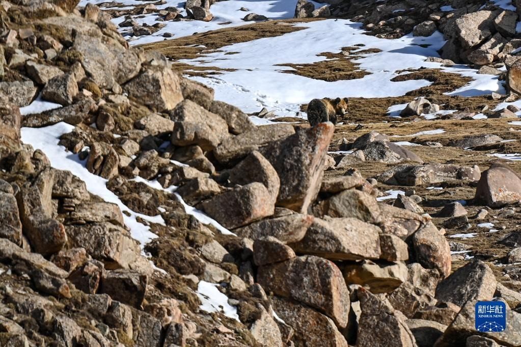 一頭藏馬熊在阿爾金山國家級自然保護區(qū)覓食(5月23日攝)。