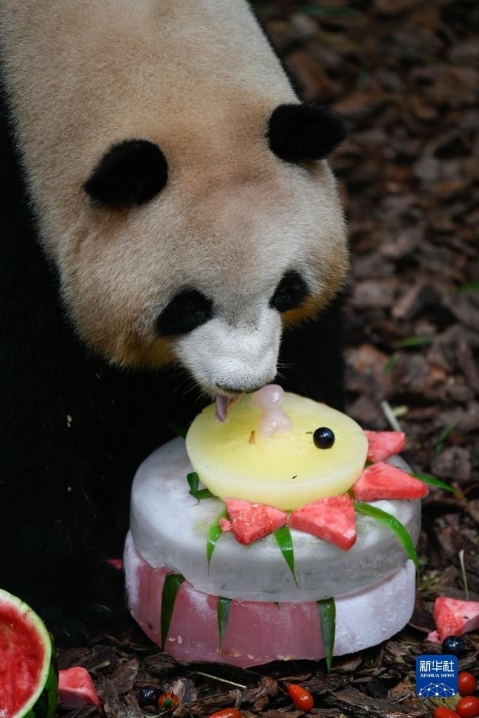 5月29日,在成都大熊貓繁育研究基地都江堰野放繁育研究中心,梅蘭在品嘗飼養(yǎng)員為它準備的冰蛋糕。