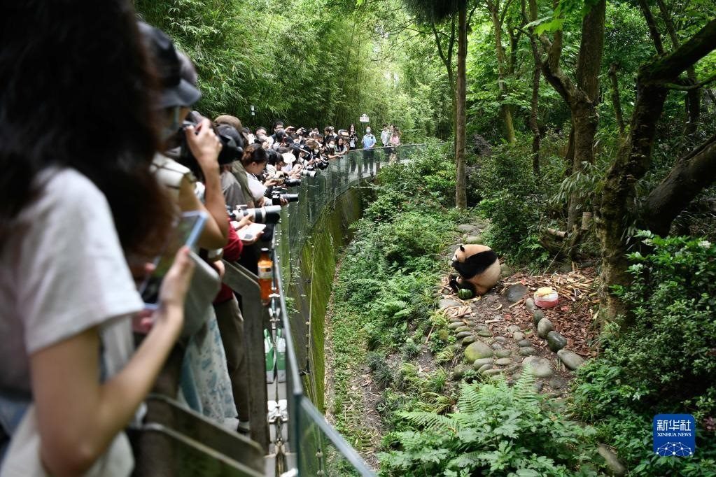 5月29日,在成都大熊貓繁育研究基地都江堰野放繁育研究中心,游客與梅蘭生日裝飾品合影留念。