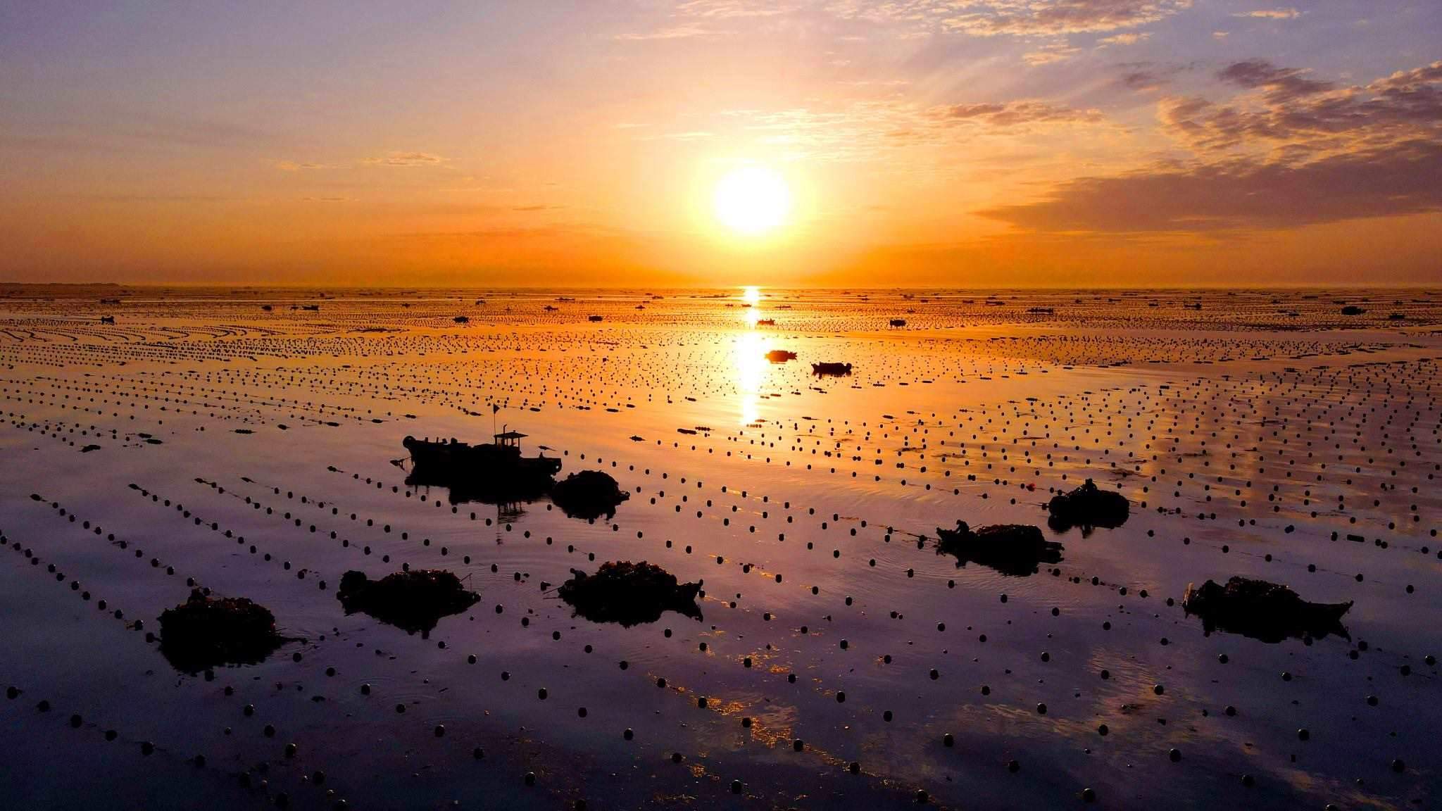 2023年5月31日,山東威海,榮成愛倫灣海洋牧場(chǎng),漁民駕駛船只在海上收獲海帶,美麗的朝霞倒影在海上,海鷗伴舞,海洋牧場(chǎng)到處呈現(xiàn)一派豐收的喜人景象。視覺中國