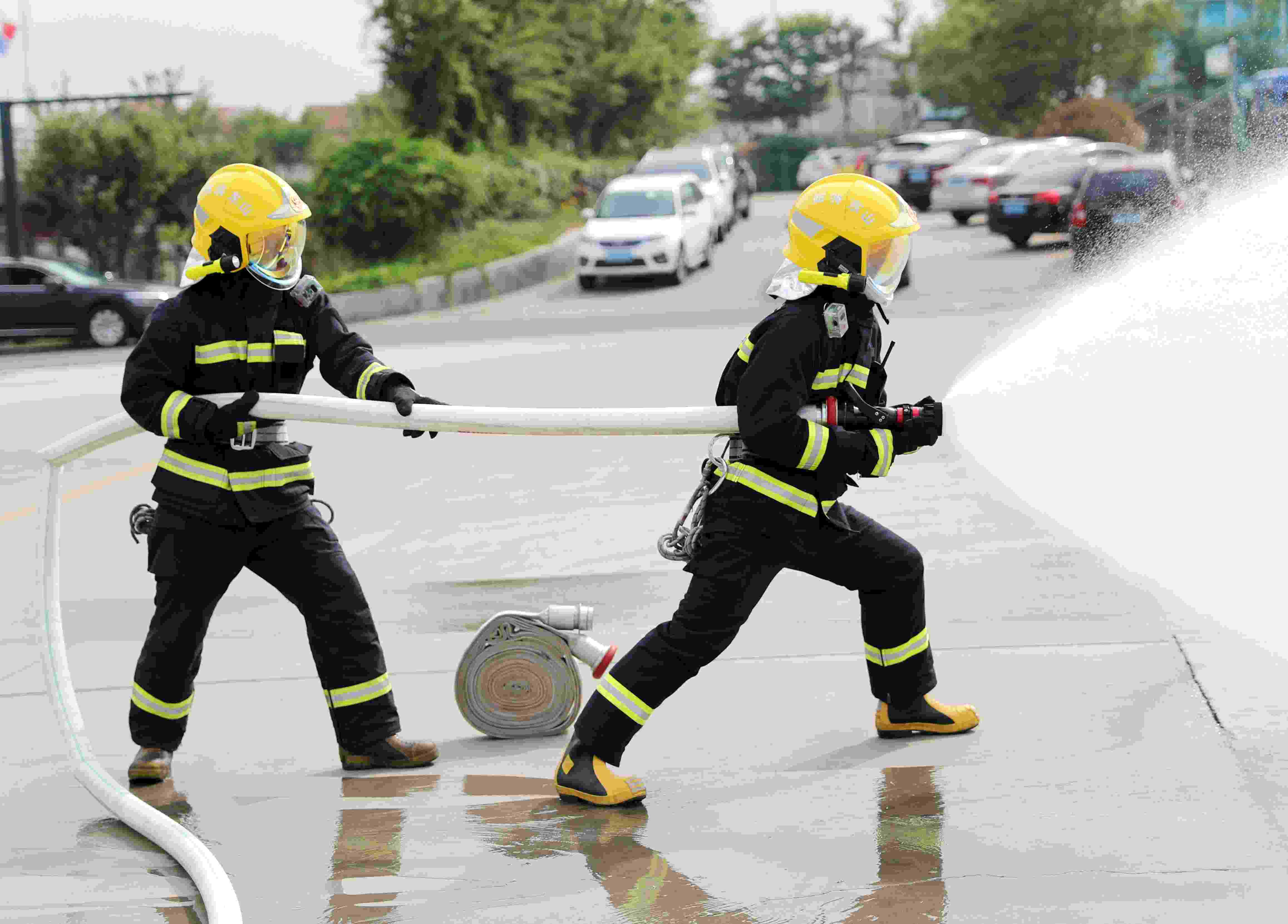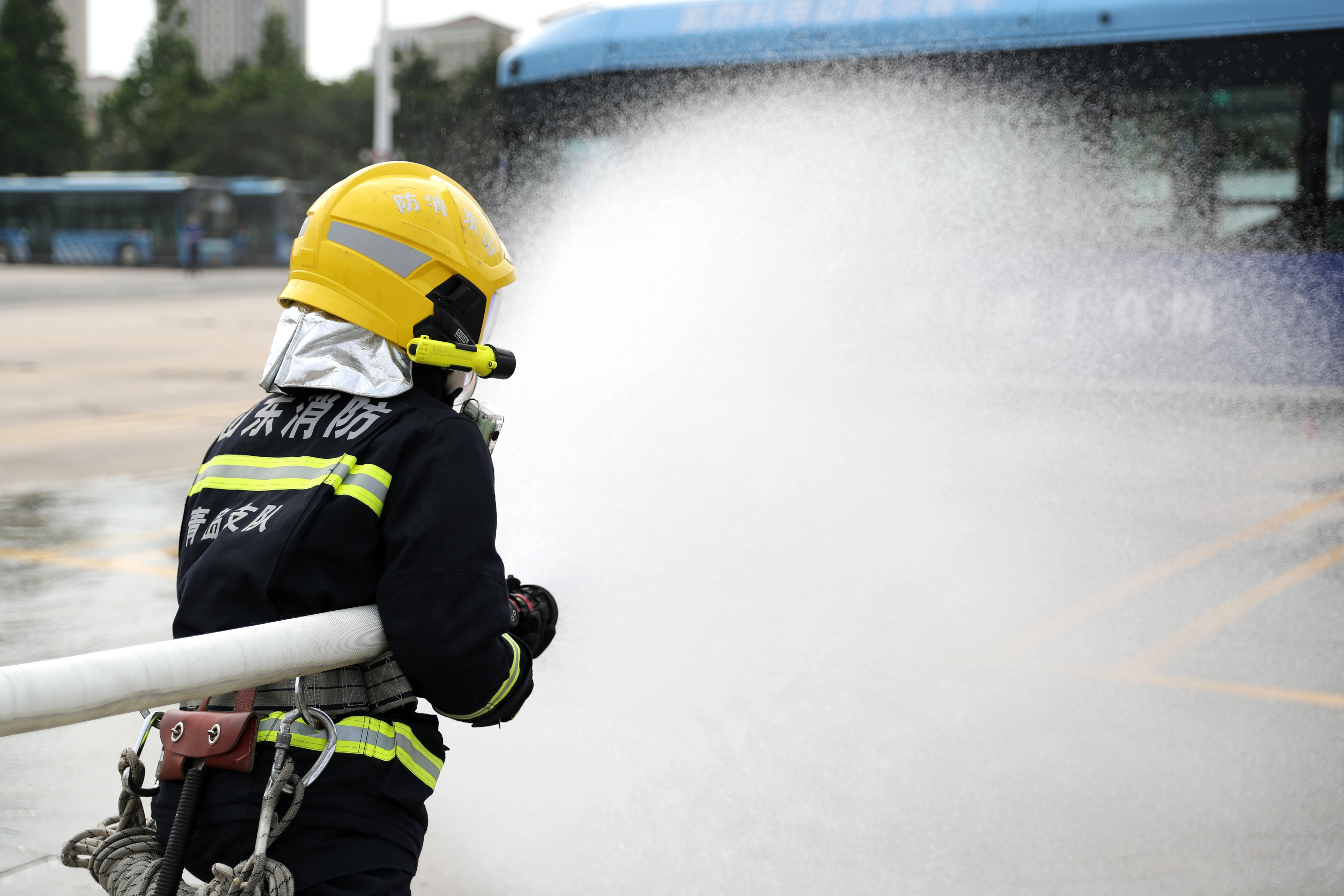 5月30日,山東青島,消防官兵在進行公交車氫氣管路受損泄漏應(yīng)急處置演練。