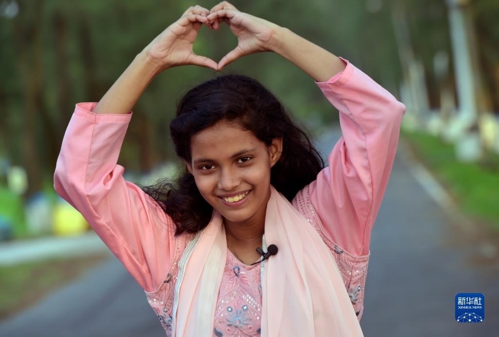 5月26日,在孟加拉國(guó)首都達(dá)卡,阿里法·沁做出愛心手勢(shì)表達(dá)對(duì)中國(guó)的愛意。新華社發(fā)
