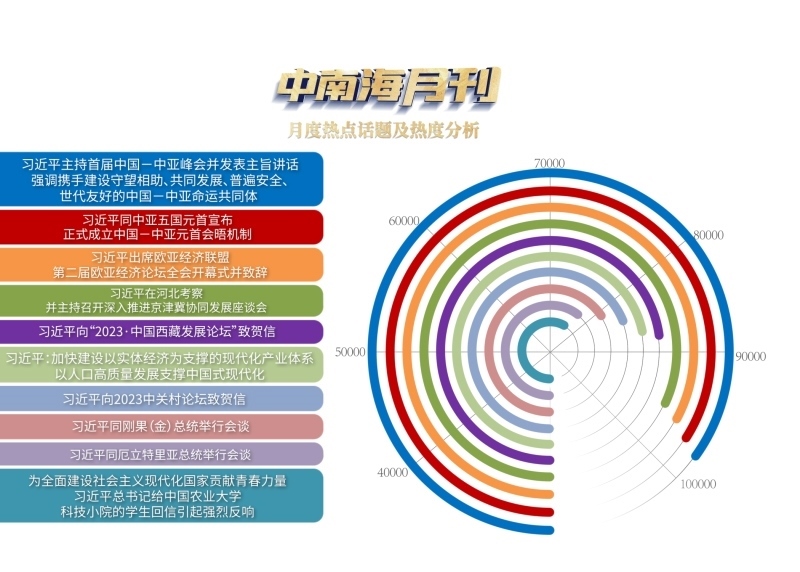 央視網(wǎng)“智聞”系統(tǒng)提取分析5月全網(wǎng)時(shí)政新聞熱點(diǎn)顯示,“習(xí)近平主持首屆中國(guó)—中亞峰會(huì)并發(fā)表主旨講話 強(qiáng)調(diào)攜手建設(shè)守望相助、共同發(fā)展、普遍安全、世代友好的中國(guó)—中亞命運(yùn)共同體”“習(xí)近平同中亞五國(guó)元首宣布正式成立中國(guó)—中亞元首會(huì)晤機(jī)制”“習(xí)近平出席歐亞經(jīng)濟(jì)聯(lián)盟第二屆歐亞經(jīng)濟(jì)論壇全會(huì)開幕式并致辭”等元首外交活動(dòng)備受關(guān)注。