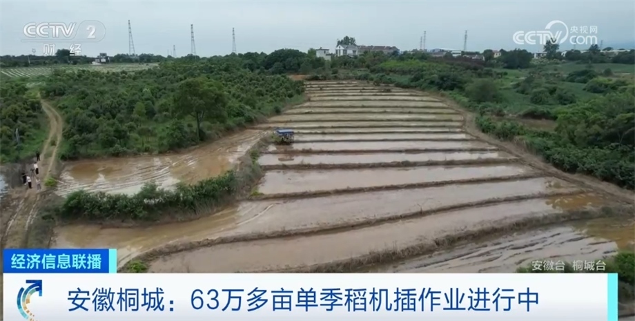 這些秧苗來自附近的育秧大棚,由于生長環(huán)境可調(diào)可控,秧苗健壯,普遍長勢良好。今年,桐城市中稻種植面積達(dá)63.5萬畝,當(dāng)?shù)赝度霗C械4000多臺套,單季稻機械化率達(dá)96%。截至目前,插秧工作已完成80%。