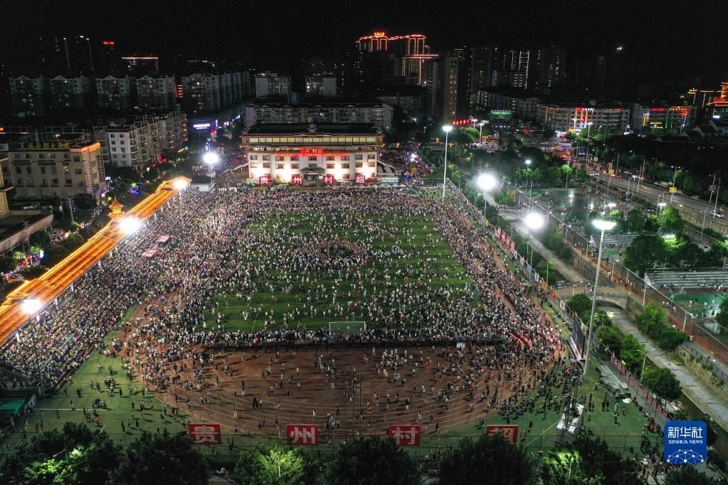 6月10日,演員在貴州“村超”足球比賽后表演民族舞蹈“多耶”,現(xiàn)場(chǎng)觀眾一起上場(chǎng)狂歡(無人機(jī)照片)。