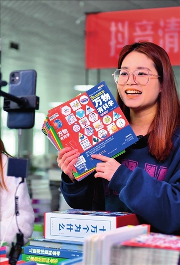 廊坊市永清經(jīng)濟(jì)開(kāi)發(fā)區(qū)京聯(lián)集團(tuán)館配圖書(shū)聯(lián)合現(xiàn)采基地,工作人員在電商平臺(tái)直播銷(xiāo)售圖書(shū)(2023 年 3 月 26 日攝) 駱學(xué)峰攝 / 本刊