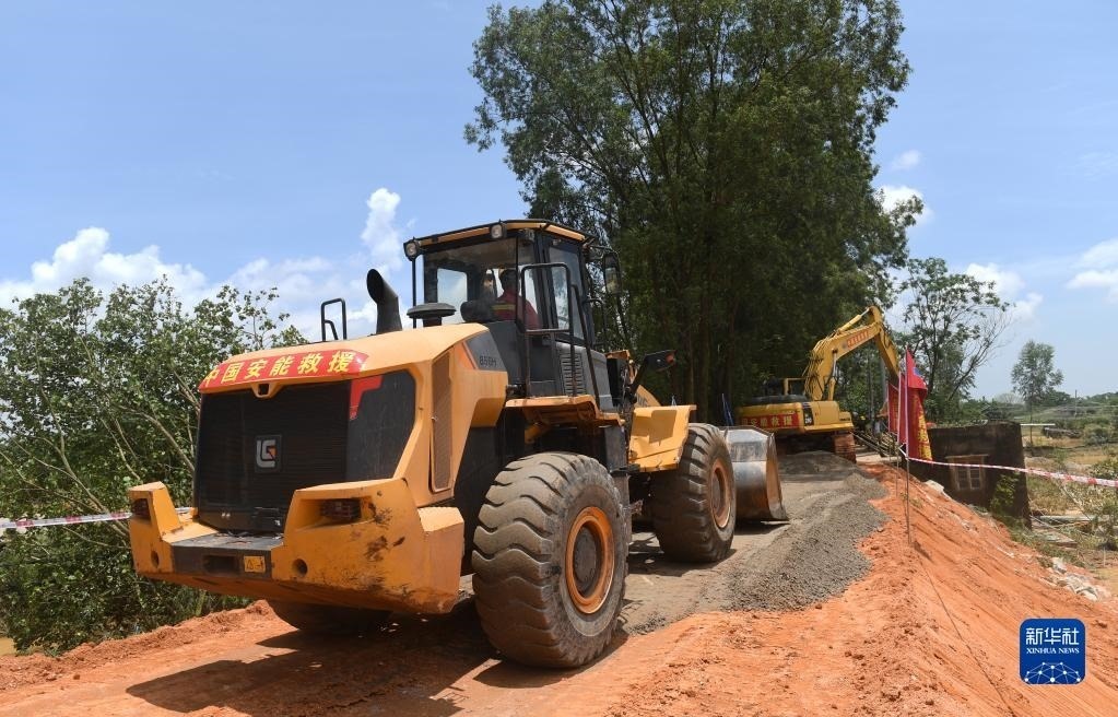 6月11日,在廣西合浦縣白沙鎮(zhèn),工人在施工修復(fù)遭洪水損毀的堤壩。