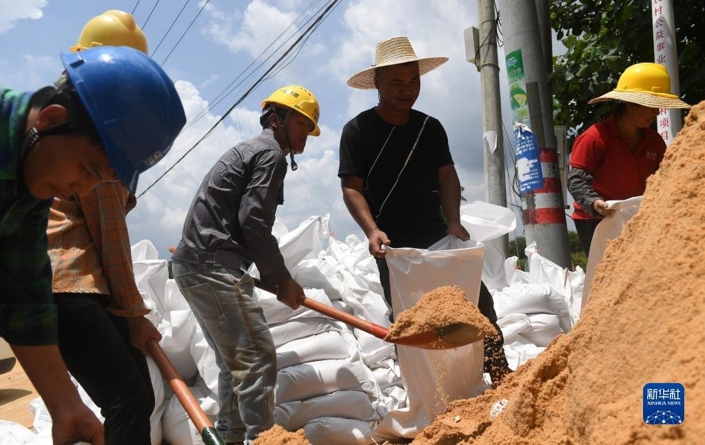 6月11日,在廣西合浦縣白沙鎮(zhèn),人們?cè)谘b沙子準(zhǔn)備修復(fù)遭洪水損毀的堤壩。