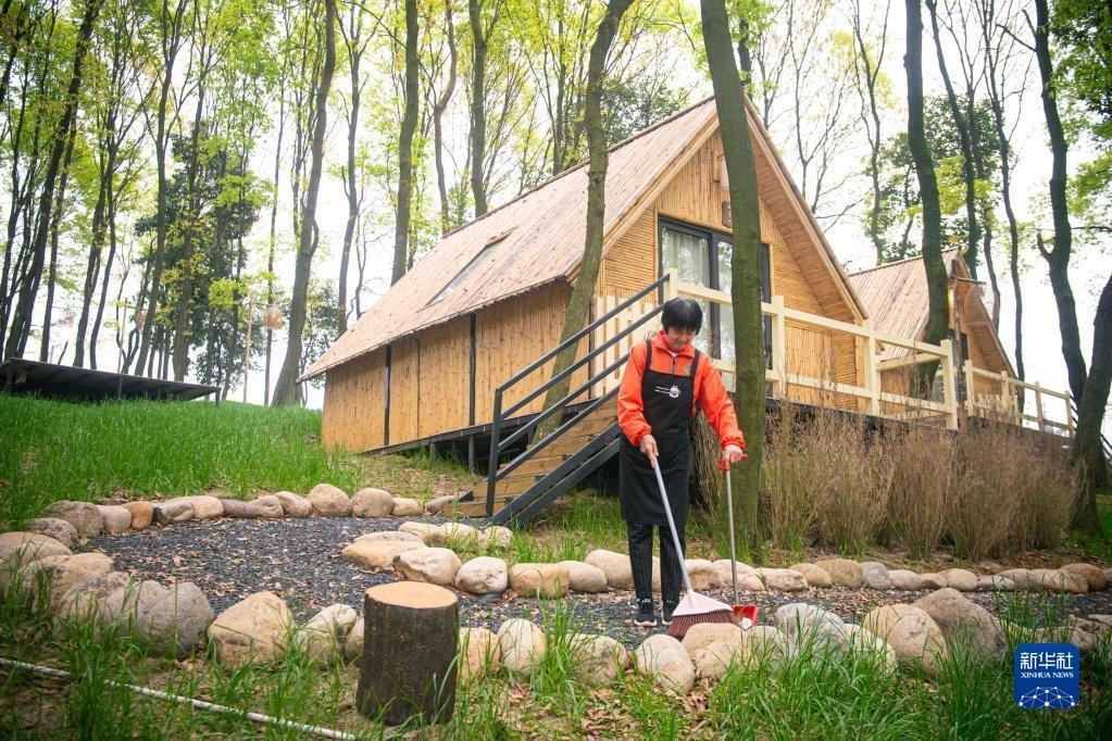 浙江諸暨楓橋鎮(zhèn)陽春村村民在一家度假村內(nèi)工作(3月29日攝)。當(dāng)?shù)赝ㄟ^閑置荒山土地流轉(zhuǎn)發(fā)展鄉(xiāng)村旅游,幫助陽春村60名村民實現(xiàn)在家門口就業(yè)增收。新華社記者 黃宗治 攝
