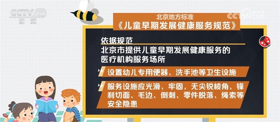 依據(jù)規(guī)范,北京市提供兒童早期發(fā)展健康服務(wù)的醫(yī)療機(jī)構(gòu)服務(wù)場(chǎng)所應(yīng)遠(yuǎn)離各種污染源,采光充足,通風(fēng)良好,遠(yuǎn)離噪聲與電磁干擾;設(shè)置防蚊、蟲、蠅、鼠等設(shè)備,并放置于兒童無(wú)法接觸到的地方;室內(nèi)空氣溫度、濕度、化學(xué)性、生物性及放射性物質(zhì)濃度應(yīng)符合相關(guān)要求。應(yīng)設(shè)置哺乳室,面積不少于10平方米;設(shè)置幼兒專用便器、洗手池等衛(wèi)生設(shè)施;服務(wù)設(shè)施應(yīng)光滑、牢固,無(wú)尖銳棱角、鋒利切面、毛邊、倒刺、零件脫落、繩索等安全隱患。