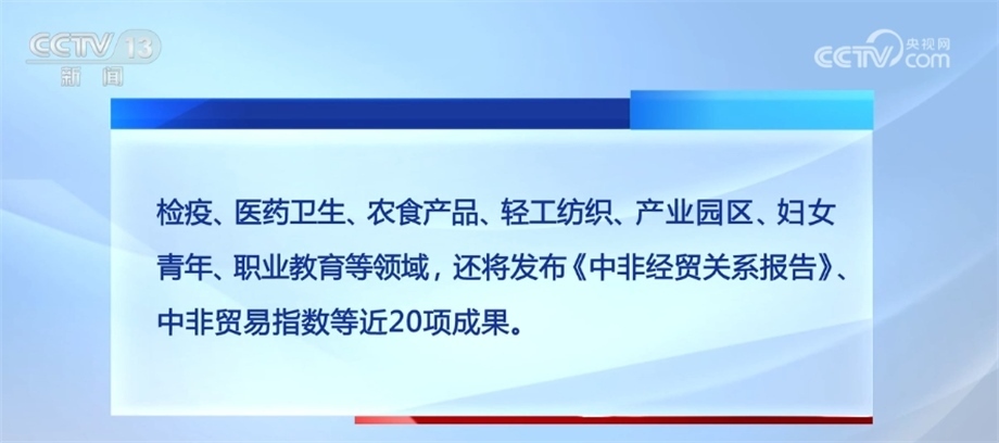 會(huì)期內(nèi)將舉辦開幕式暨中非經(jīng)貿(mào)合作論壇,9場由國家部委和機(jī)構(gòu)主辦的高端活動(dòng)、7場經(jīng)貿(mào)對(duì)接、3場專題研討和13場地方專場活動(dòng),涵蓋綠色基建、海關(guān)檢疫、醫(yī)藥衛(wèi)生、農(nóng)食產(chǎn)品、輕工紡織、產(chǎn)業(yè)園區(qū)、婦女青年、職業(yè)教育等領(lǐng)域,還將發(fā)布《中非經(jīng)貿(mào)關(guān)系報(bào)告》、中非貿(mào)易指數(shù)等近20項(xiàng)成果。