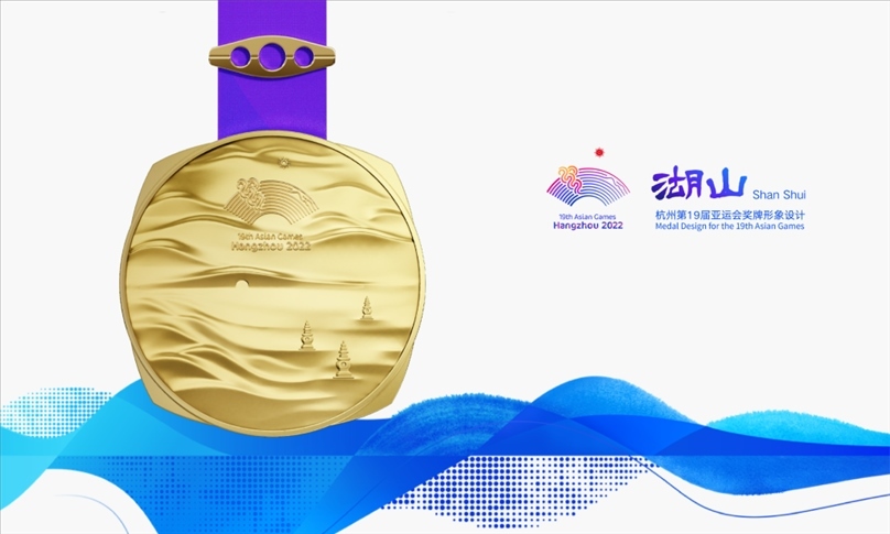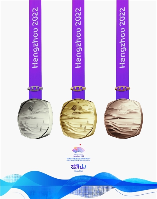 獎牌取名為“湖山”,它的設計靈感源自五千年良渚文明,展示中國江南文化,呈現杭州山水景觀。在亞運會獎牌設計中首次將方形玉琮和圓形獎章融為一體,其中獎牌正面用凸出的線條勾勒出“三面云山一面城”的杭城畫卷,湖水漣漪,山巒起伏;獎牌背面,形似方形印章,寓意運動員們在杭州亞運會上留下美好的印記。