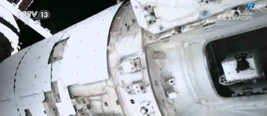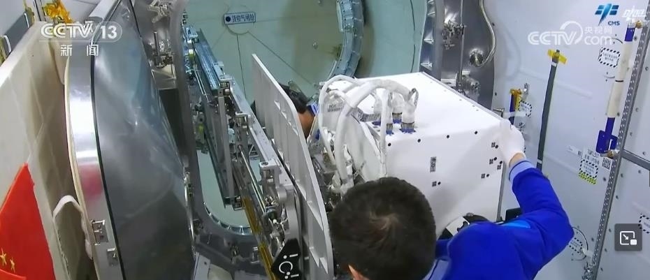 這是3位航天員正在夢天實驗艙進(jìn)行空間輻射生物學(xué)暴露實驗裝置出艙工作,航天員將載荷安裝到載荷轉(zhuǎn)移機(jī)構(gòu)。載荷出艙前,航天員在反復(fù)仔細(xì)檢查,隨后,關(guān)閉夢天實驗艙貨物氣閘艙艙門。通過該裝置開展空間粒子輻射等環(huán)境要素,對樣本材料生物學(xué)效應(yīng)的研究,為科學(xué)實驗生物樣品提供生命保障。