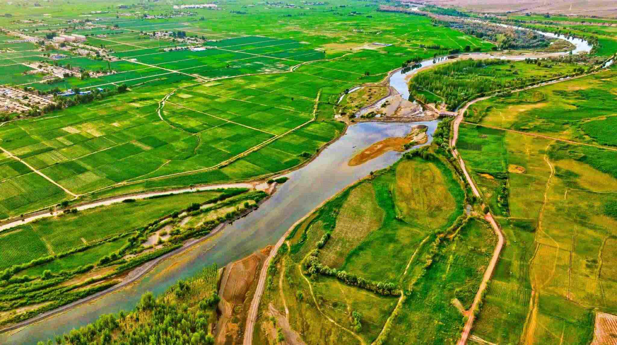 2023年6月15日,甘肅省張掖市,甘州區(qū)靖安鄉(xiāng)、臨澤縣板橋鎮(zhèn)境內(nèi)的黑河兩岸,寬闊的河床、彎曲的河流、農(nóng)作物以及樹木、蘆葦、濕地在夕陽的映照下綠意盎然。視覺中國