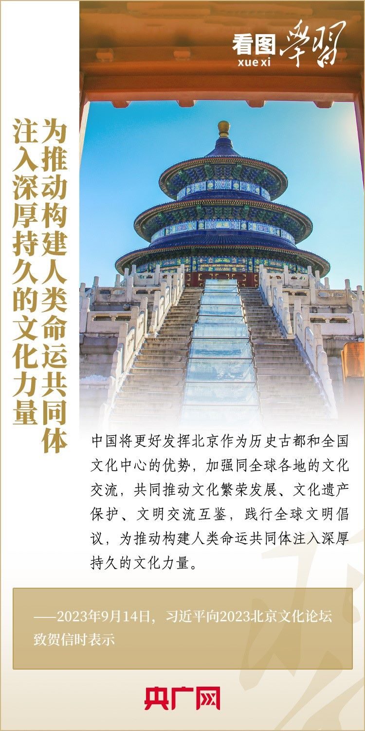 9月14日,以“傳承優(yōu)秀文化 促進(jìn)交流合作”為年度主題的2023北京文化論壇在北京開幕。習(xí)近平主席向論壇致賀信表示,中國(guó)將更好發(fā)揮北京作為歷史古都和全國(guó)文化中心的優(yōu)勢(shì),加強(qiáng)同全球各地的文化交流,共同推動(dòng)文化繁榮發(fā)展、文化遺產(chǎn)保護(hù)、文明交流互鑒,踐行全球文明倡議,為推動(dòng)構(gòu)建人類命運(yùn)共同體注入深厚持久的文化力量。