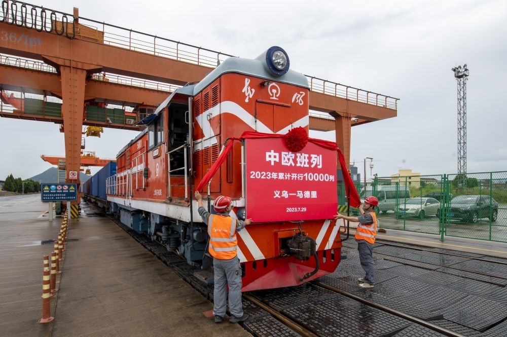 ↑2023年4月23日在義烏西站拍攝的“義烏-中亞五國10周年紀念號”中歐班列。