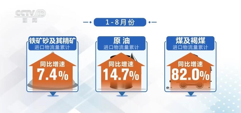 從進口來看,隨著內需改善,進口物流也呈現量價回升。1—8月份進口物流總額同比增長14.4%,增速持續(xù)回升。從產品結構看,原材料等大宗商品進口增速有所加快,鐵礦砂及其精礦、原油、煤及褐煤進口物流量累計同比增速分別為7.4%、14.7%、82.0%。