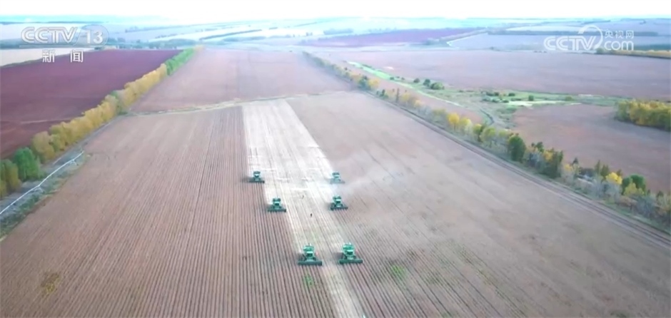 您現(xiàn)在看到的是黑龍江墾區(qū)鶴山農(nóng)場的大豆“高產(chǎn)攻關(guān)”示范田,眼下正是大豆收獲的高產(chǎn)期,農(nóng)場每天出動52臺收獲機(jī),節(jié)糧減損,確保豐收的糧食顆粒歸倉。