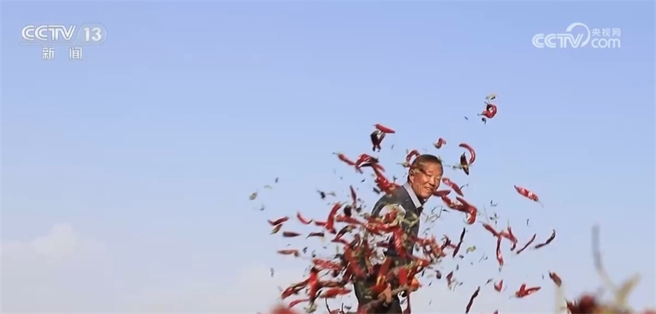 跟隨鏡頭,我們來到了新疆巴州和碩縣廣袤的戈壁灘上。眼下,50多萬畝紅辣椒進(jìn)入全面采收晾曬季,放眼望去,一片片“紅色地毯”散發(fā)著熱辣的氣息。遍地的紅辣椒被有序鋪開,村民們穿梭其中,透著豐收的喜悅。當(dāng)?shù)剞r(nóng)業(yè)部門測算,今年當(dāng)?shù)乩苯樊a(chǎn)量可達(dá)140萬噸以上,辣椒采收及晾曬工作將持續(xù)至11月前后。