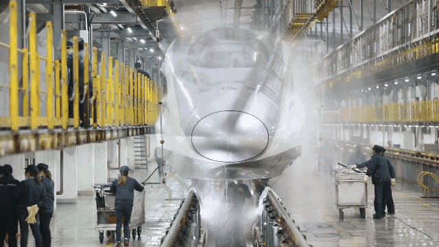 在外“奔波”了一整天的高鐵動車組回到動車所后,首先會沿著鋼軌來到洗車房“洗個澡”。當動車通過洗車房時,“機洗房”便自動開啟智能工作模式。列車以3至5公里的時速開過“澡堂”時,數(shù)十個“花灑”噴嘴會給車身預濕,之后的噴嘴噴灑專用“沐浴露”,斜刷、側刷、底刷快速投入工作。