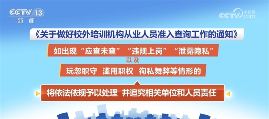 此外,《通知》強調(diào)嚴明查詢管理責任。各級教育部門和相關主管部門、校外培訓機構(gòu)及其工作人員應履行準入查詢的法定職責,如出現(xiàn)“應查未查”“違規(guī)上崗”“泄露隱私”以及玩忽職守、濫用職權(quán)、徇私舞弊等情形的,將依法依規(guī)予以處理,并追究相關單位和人員責任。