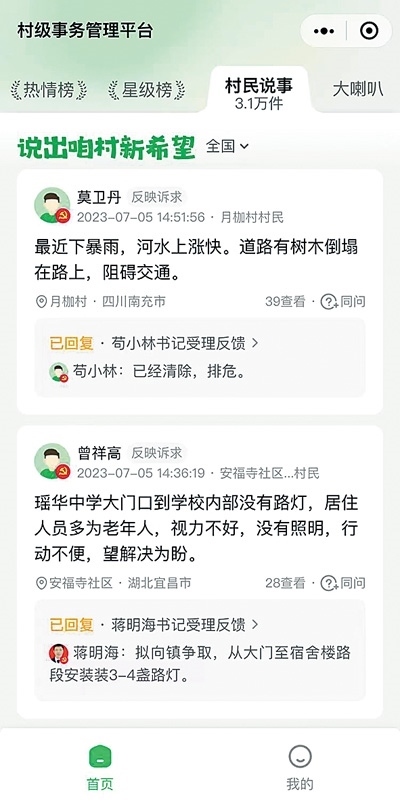 “老百姓把遇到的問題發(fā)布,我們看到后及時(shí)回復(fù)、解決,大大提高了工作效率。”舒軍說,他已經(jīng)養(yǎng)成習(xí)慣,每天都會(huì)看看村民在小程序說了啥事。