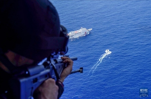 7月10日,中國(guó)海軍“和平方舟”號(hào)醫(yī)院船在太平洋上組織反恐反海盜演練。這是空中打擊組進(jìn)行火力支援。