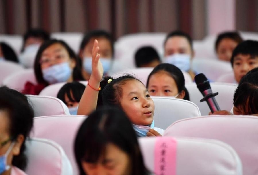 在天津市北辰區(qū)青光村黨群服務(wù)中心,學(xué)生在一場安全教育活動上回答問題。新華社記者 李然 攝