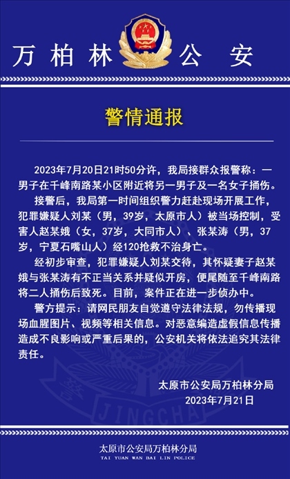 ·太原一男子懷疑妻子與他人有不正當(dāng)關(guān)系,將二人捅傷致死,已被警方當(dāng)場(chǎng)控制。