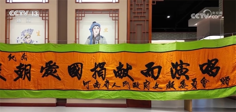 總臺(tái)記者 李恩浩:在河南省戲曲聲音博物館,有這樣一個(gè)十多米的條幅,上面寫著“為抗美援朝愛國(guó)捐獻(xiàn)而演唱”,這是香玉劇社義演的第一場(chǎng),河南省人民政府特意為了支持他們的愛國(guó)行動(dòng)贈(zèng)送的,當(dāng)時(shí)香玉劇社在全國(guó)義演時(shí)它就掛在舞臺(tái)上方。