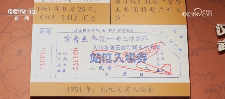 常香玉(生前采訪畫面):我說(shuō)我要捐獻(xiàn)一架戰(zhàn)斗機(jī),我要用我的演出、用我的本事、用我的力量、用我的血汗,捐獻(xiàn)一架戰(zhàn)斗機(jī)來(lái)保衛(wèi)我們的國(guó)家。