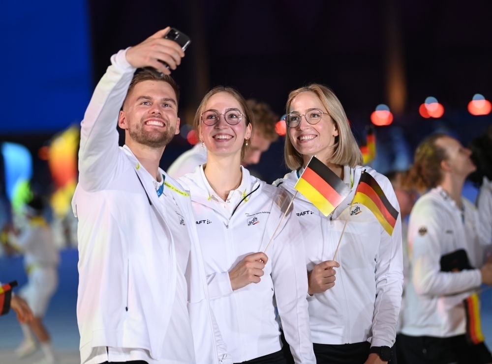 德國大學(xué)生體育代表團(tuán)在開幕式上入場。
