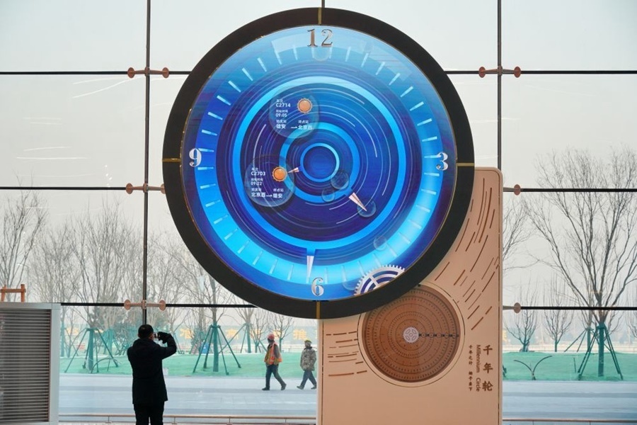 旅客在京雄城際鐵路雄安站內拍攝“千年輪”(2020年12月27日攝)。新華社記者 牟宇 攝