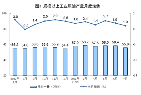 原油產(chǎn)量小幅增加,進口保持較快增長。7月份,生產(chǎn)原油1731萬噸,同比增長1.0%,增速比6月份放緩0.9個百分點,日均產(chǎn)量55.8萬噸。進口原油4369萬噸,同比增長17.0%,增速比6月份回落28.4個百分點。
