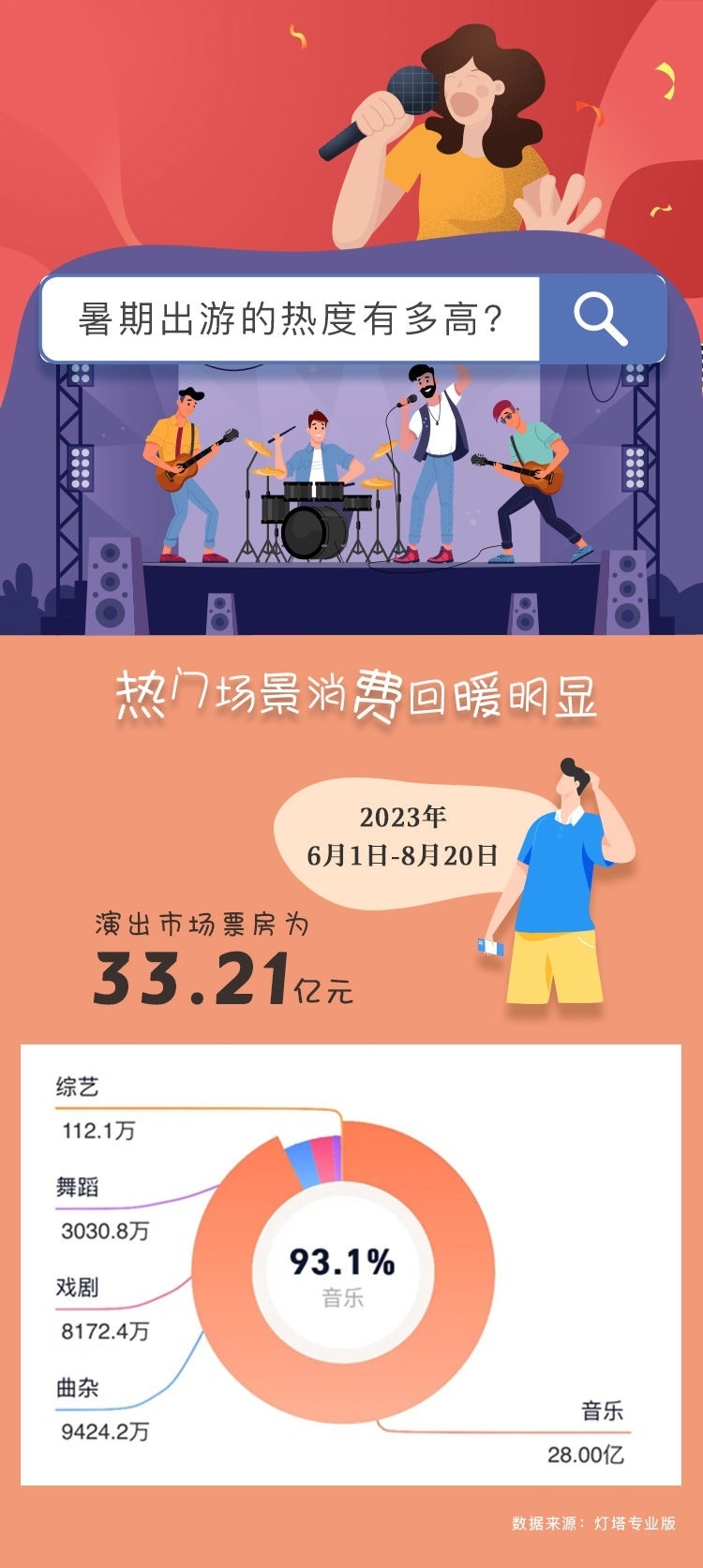 作為演出市場的傳統(tǒng)旺季,暑假期間演唱會、Live house、戲劇、音樂劇等各類熱門演出“一票難求”。根據燈塔專業(yè)版最新數(shù)據,暑期檔中的6月1日至8月23日演出市場票房已經超過30億元,而相當可觀的跨城觀演比例,更引得除了演出票房之外的周邊產業(yè)一起火?!耙粋€演出圈粉一座城”,當?shù)芈糜谓洕粩嘤楷F(xiàn)新的可能。