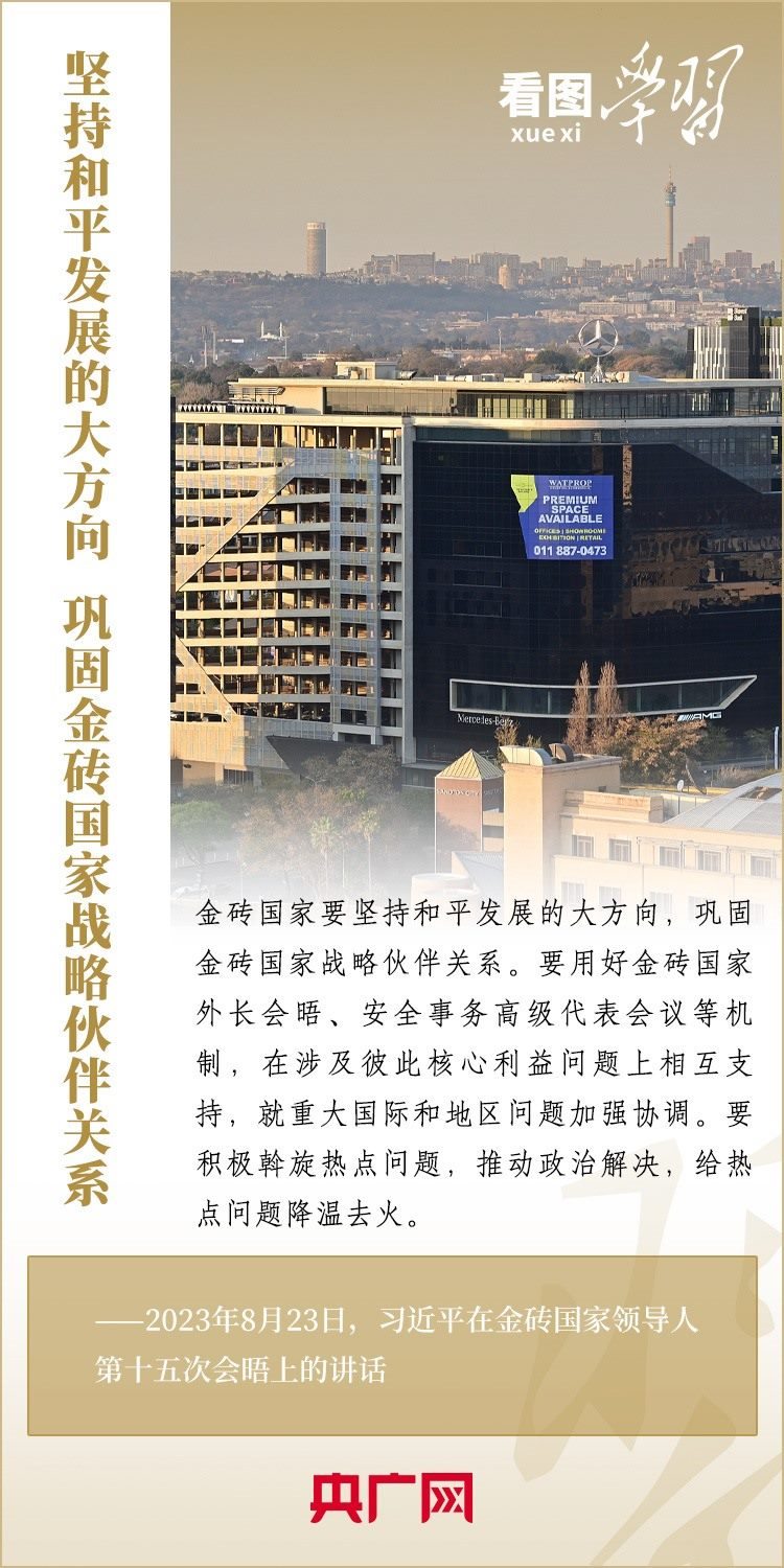 當(dāng)?shù)貢r間8月23日,習(xí)近平主席出席金磚國家領(lǐng)導(dǎo)人第十五次會晤并發(fā)表重要講話,強調(diào)金磚國家要秉持開放包容、合作共贏的金磚精神,以金磚責(zé)任應(yīng)對共同挑戰(zhàn),以金磚擔(dān)當(dāng)開創(chuàng)美好未來。一起來學(xué)習(xí)!