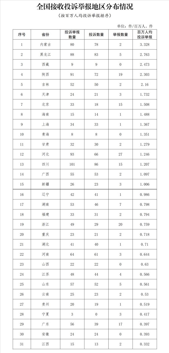 各?。ㄗ灾螀^(qū)、直轄市)按照接收投訴舉報(bào)數(shù)量排序,四川、河北、陜西、黑龍江、內(nèi)蒙古排在全國(guó)前5位。其中:按投訴數(shù)量排序,四川、黑龍江、內(nèi)蒙古、陜西、河北排在全國(guó)前5位;按舉報(bào)數(shù)量排序,河北、浙江、陜西、廣東、北京(四川并列)排在全國(guó)前5位;按百萬(wàn)人均投訴舉報(bào)數(shù)量排序,內(nèi)蒙古、黑龍江、西藏、陜西、吉林排在全國(guó)前5位。(全國(guó)接收投訴舉報(bào)地區(qū)分布情況詳見附件1)
