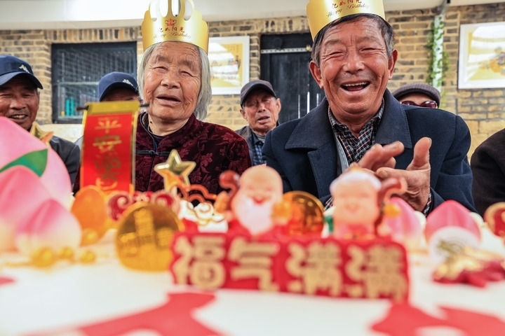 老人在山東榮成夏莊鎮(zhèn)甲夼馬家村“暖心食堂”過生日(2021年4月16日攝)。新華社發(fā)(李信君 攝)