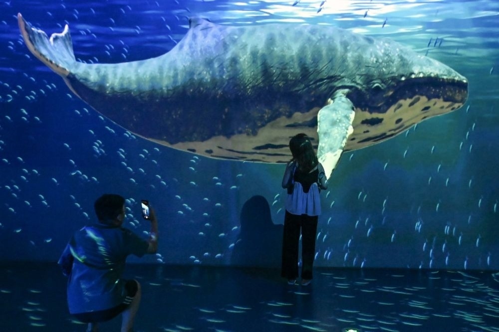 正值大型沉浸式互動(dòng)數(shù)字藝術(shù)作品《鯨奇物語》光影藝術(shù)展首展上映,國家海洋博物館里人頭攢動(dòng)。