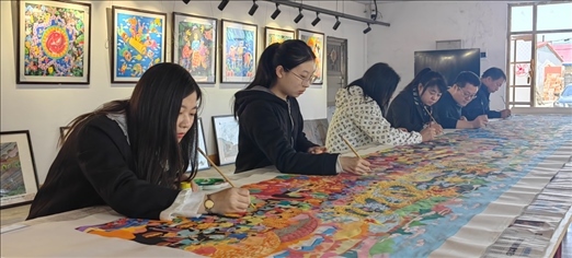 吉林省梨樹縣民間藝術家正在創(chuàng)作《關東七彩農(nóng)民畫、心系亞運向未來》農(nóng)民畫。受訪者供圖