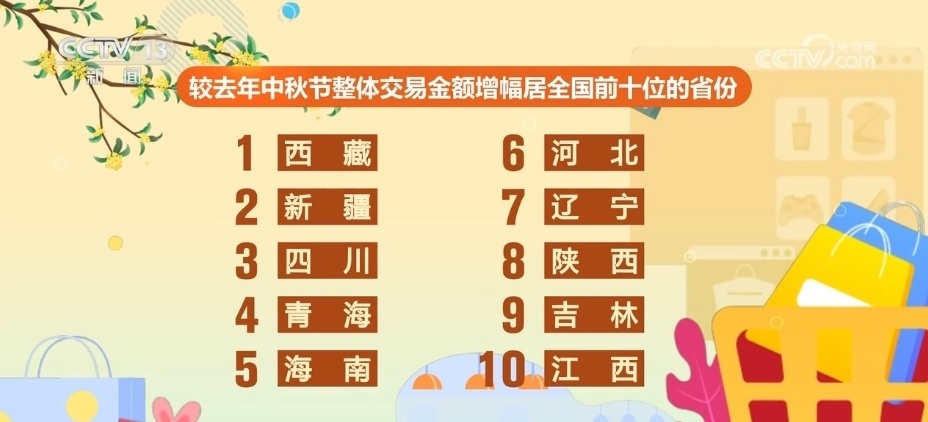 從地區(qū)上看,較2022年中秋節(jié)整體交易金額增幅居全國前10位的省份,分別是西藏、新疆、四川、青海、海南、河北、遼寧、陜西、吉林、江西。