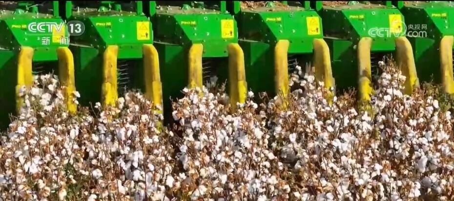 作為棉花主產(chǎn)區(qū),新疆棉花陸續(xù)進(jìn)入采收季。現(xiàn)在您看到的是位于新疆昌吉瑪納斯縣的棉田。采棉機(jī)在田里穿行,所到之處,棉花從棉稈上脫離,氣流將棉花推送到儲存棉箱,采凈率高達(dá)95%以上。這樣一臺采棉機(jī)每天可采收700余畝棉花?,敿{斯是國家級優(yōu)質(zhì)商品棉生產(chǎn)基地。從播種到采收,這里的機(jī)械化,大大提高作業(yè)速度和棉花質(zhì)量。
